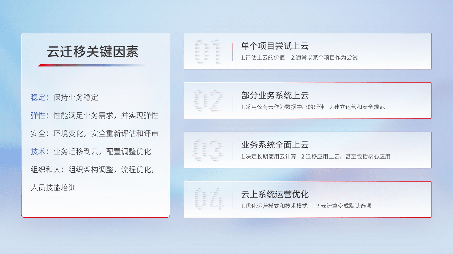 结合实际业务,,,从规划设计、、、、云平台选型、、、、云原生改造、、、、数据迁移、、集成交付,,,迁移全过程为客户识别最佳上云路径,,,做好风险识别管理,,设计网络架构、、身份权限、、安全审计合规、、、、操作审计、、、、日志审计、、、、监控告警策略、、、多站点容灾设计等,,,,对云上基础设施进行整体规划,,,提升IT治理水平,,,,以满足弹性、、高可用、、、高性能的需求。。