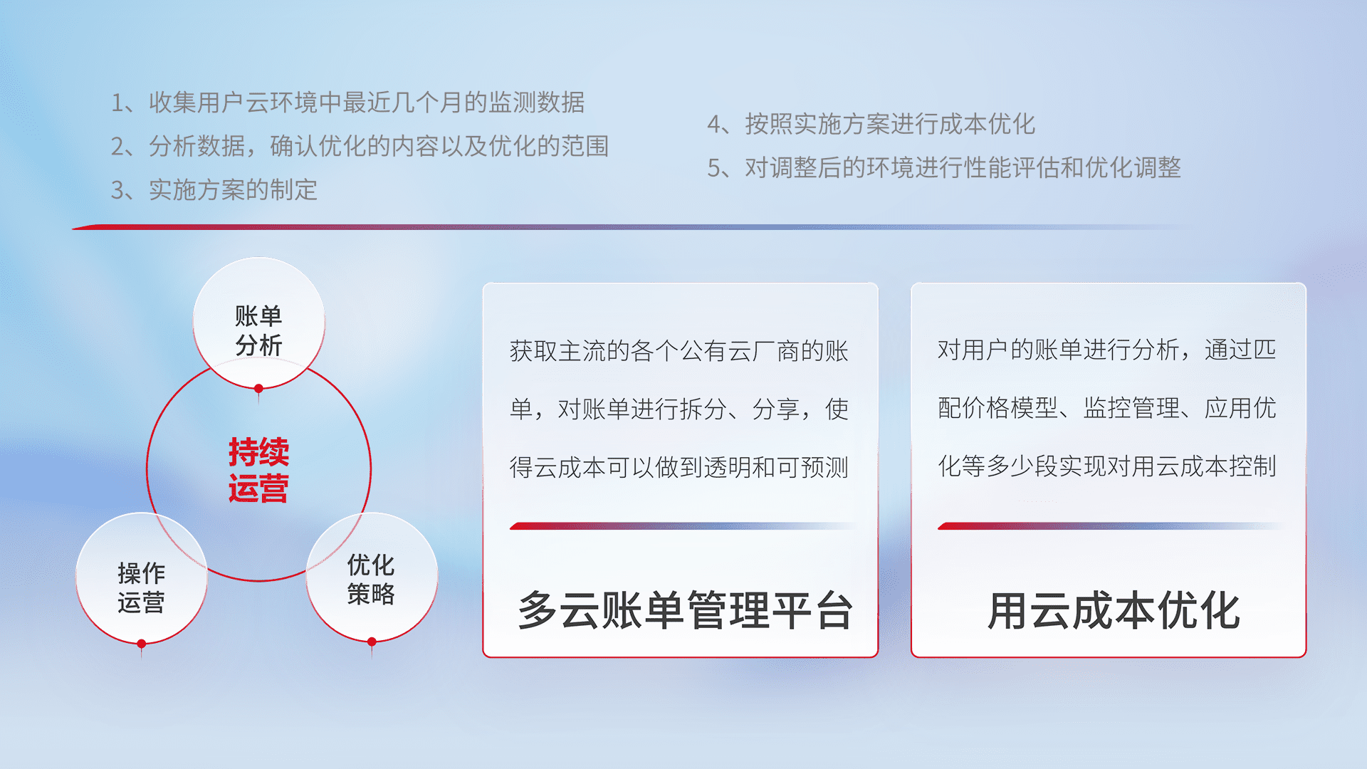 通过多云纳管,,,以统一的资源数据模型把客户的云资源进行抽象和封装,,,进而实现对多云资源的统一操作,,保障云资源管理的可靠性、、、稳定性与可用性。。。量身定制化运维内容,,,,配置、、、开发运维、、补丁管理、、备份、、、监控、、、认证和访问管理、、审计和日常巡检等,,,,保障在用云过程中的可靠度,,稳定度以及高可用率。。。
